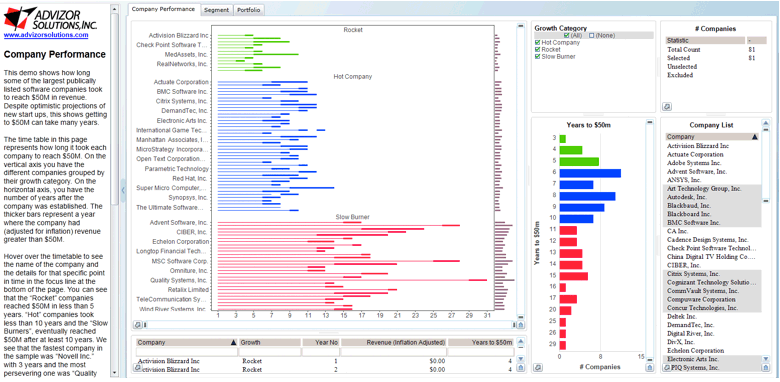 Experience ADVIZORTake a test run with one of our demo projects. Check out some of our unique visualizations, and explore the concept of visual discovery. You’ll experience our philosophy of “up and running in 10 to 30 seconds”, and then “sub-second interaction no matter what you are trying to do”. Some of these demos run on single tables, others are loading 20+ tables. If you’re using a browser just click on one of these links: